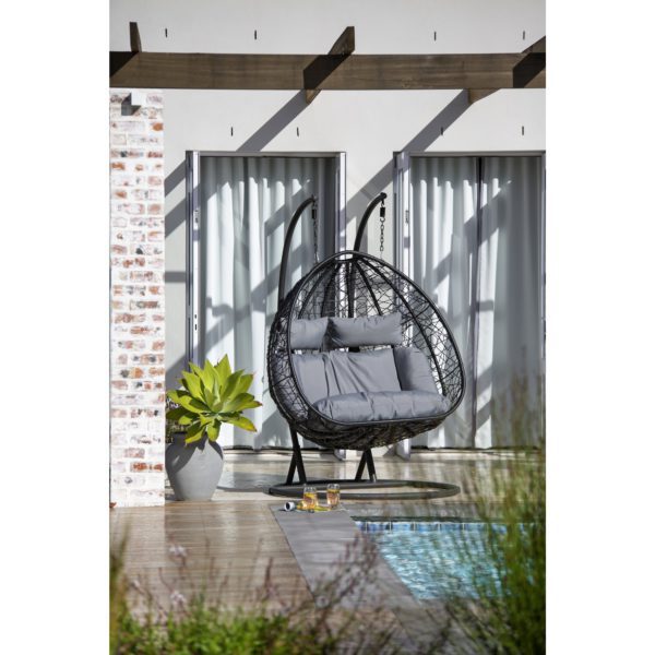 Notre chaise suspendu double « Klifton » dispose d’une hauteur d’assise réglable, de coussin d’assise et de nuque amovible, d’une ceinture de sécurité pour s’assurer que le fauteuil ne bascule pas trop haut et aussi d’un accroche-regard pour le jardin.