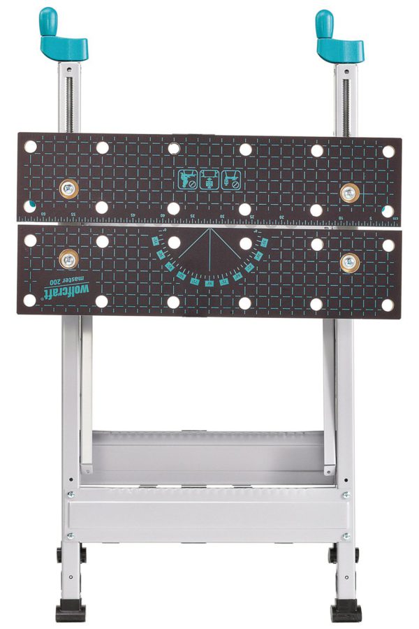 Le MASTER 200 est un établi de serrage et de bricolage repliable, pour une utilisation multifonction équipé d’un plateau de travail en MDF grande longévité. Il vous offre une hauteur de travail confortable de 80 cm. La barre d’outils intégrée vous permet d’avoir rapidement vos outils à portée de main. 2 manivelles vous permettent de diviser la surface de travail de la table 64,5 x 30 cm du MASTER 200. L’espacement qui en résulte, d’une ouverture maxi de 14,5 cm vous permet de fixer des pièces de manière sûre et sans effort. Pour de plus grandes ouvertures de 36,5 cm maxi, vous pouvez utiliser les mors en plastique fournis que vous placez simplement dans les perforations du plateau prévues à cet effet. L’établi est livré avec 4 mors en plastique pour serrage à plat. Un solide mécanisme de pliage rapide avec poignées de visssage vous permet de replier le MASTER 200 à plat et avec un faible encombrement, dimensions plié : 64,5 x 19 x 103,5 cm. Malgré son faible poids de 12 kg, l’établi supporte des charges jusqu’à 180 kg et permet de travailler sur un établi parfaitement stable. Il vous offre donc non seulement de la flexibilité, mais aussi une parfaite stabilité.