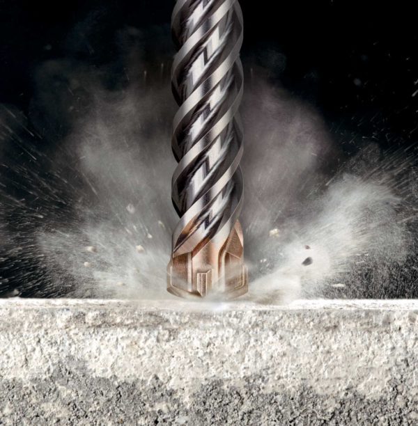 - Pointe en carbure à quatre hélices pour éviter le coincement dans les barres d’armature, ce qui permet également d’obtenir des trous plus propres et plus concentriques et une vitesse de perçage élevée et constante