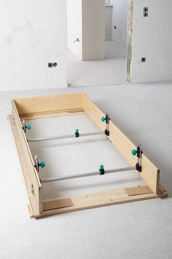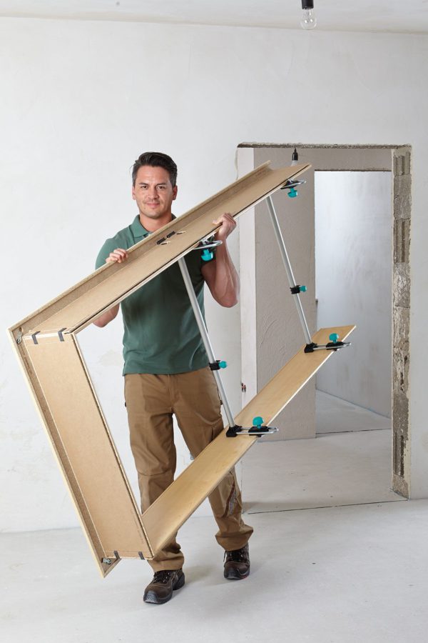 Avec un potentiel d’économies d’env. 45–70 euros par porte intérieure, le montage par soi-même est un projet de bricolage attirant que vous pouvez maîtriser sans problème avec le kit de pose de châssis de porte EASY. Le plus gros avantage de cet outil malin est que vous pouvez le fixer directement sur le montant encore couché. Ainsi, il reste fixé et ne tombe pas lors de l’alignement et du montage. Bloqué sur les parties latérales, le kit de pose Easy supporte et protège le montant lors du transport et de la mise en place. L’alignement vertical et horizontal est également optimal grâce cet outil utile à la fixation. Vous vous épargnez l’ajustement fastidieux avec des tasseaux ou des cales en bois. Le kit de pose EASY convient à toutes les dimensions de portes courantes 610/735/860/985 mm.