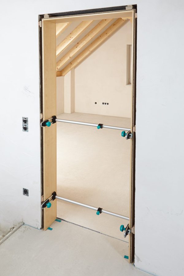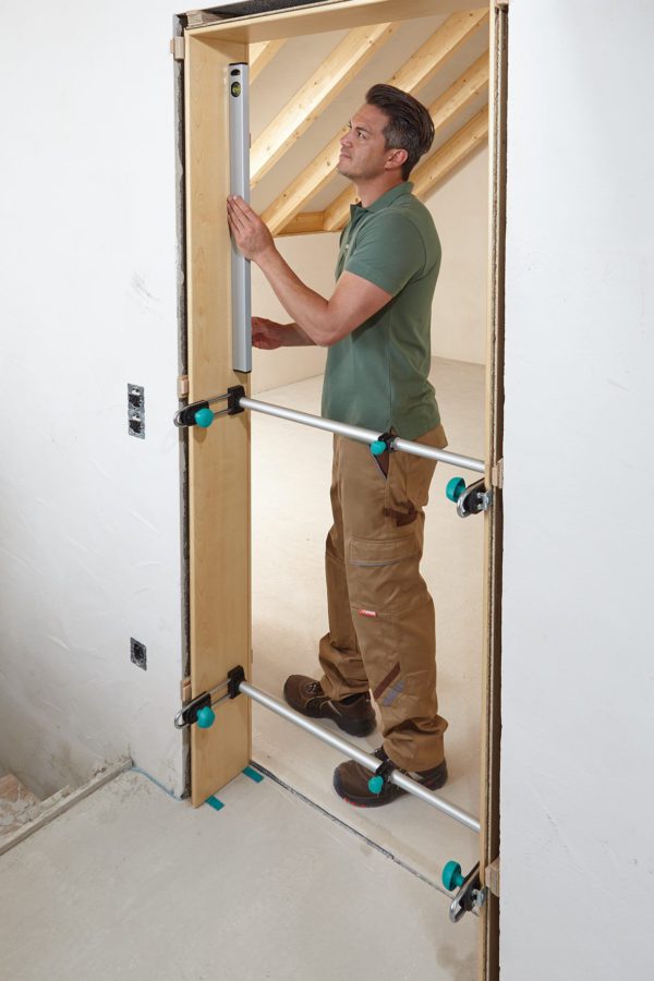 - immobilise le châssis de porte lors de sa fixation par mousse expansive et garantit le parallélisme des parties latérales