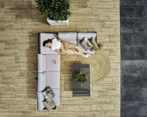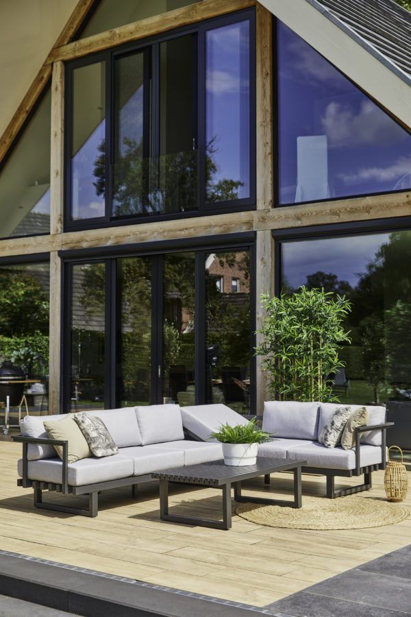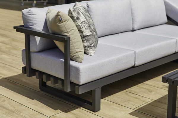 Le parfait ensemble de salon. Le salon Calabria se caractérise par sa taille, sa robustesse et son confort. Dans le coin du canapé se trouve une chaise longue intégrée polyvalente. Réglez la hauteur et accordez-vous du temps pour vous détendre. Les lignes uniques que vous voyez sur la table et dans le fond du salon font de cet ensemble un véritable accroche-regard dans votre jardin !