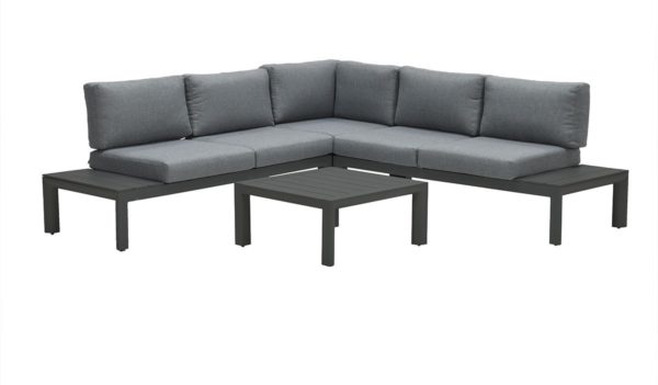Ensemble 1 canapé d’angle, table basse et 2 tables d’appoint / Structure aluminium / Coussins hydrofuges déperlants