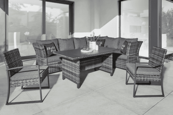 2 fauteuils, canapé d’angle, environ 199 x 254 cm (3 possibilités de positionnement, les accoudoirs peuvent être abaissés des deux côtés), table avec plateau en verre de sécurité, environ 145 x 85 cm.