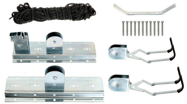 • Kit composé de deux crochets ajustables avec galet de guidage, d’un support de drisse, 15 m de corde