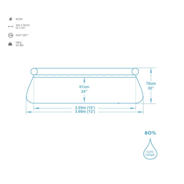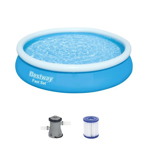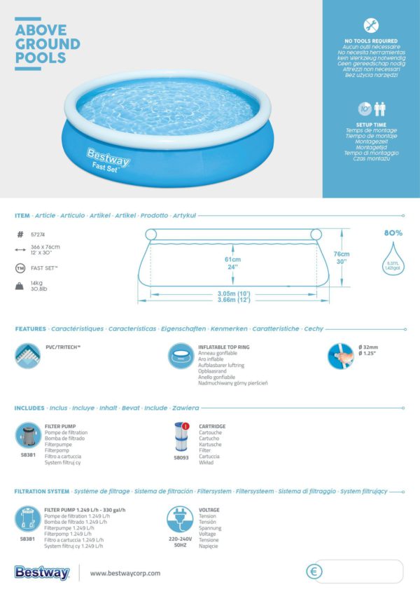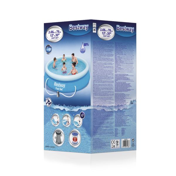 La piscine Fast Set d’un diamètre de 3.66 m et d’une hauteur de 76 cm, est une excellente piscine pour toute la famille. Il peut être installé en quelques minutes sur une surface plane, car seul l’anneau supérieur doit être gonflé. Les parois de la piscine se mettent en place lorsqu’elles sont remplies d’eau. Le kit comprend une pompe à filtre de 1249 litres et une cartouche filtrante pour garder l’eau fraîche et propre. La piscine est équipée d’une vanne de vidange qui permet une vidange rapide à la fin de la saison de baignade. La piscine Fast Set est fabriquée en Tritech pour une durabilité extrême et un plaisir de baignade en famille garanti pour les années à venir !