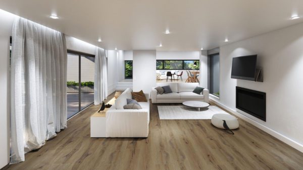 Ce sol design robuste et facile d’entretien de la collection « Rigid 55 Lock Acoustic » au décor bois PUNO BROWN est idéal pour les zones résidentielles et commerciales à usage intensif grâce à la couche d’usure de 0,55 mm. Les planches de conception de maison de campagne ont également une réduction acoustique intégrée jusqu’à 18 dB et peuvent être posées flottantes avec un simple système de clic, même sur le chauffage au sol et dans les pièces humides.