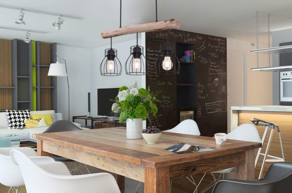 Suspension extravagante et élégante en métal noir qui donne une belle allure dans presque toutes les pièces. Trois douilles sont fixées à une poutre en bois suspendue, qui sont entourées d’un abat-jour rond en forme de grille.
