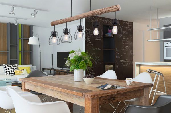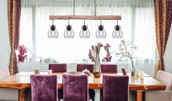 Suspension extravagante et élégante en métal noir qui donne une belle allure dans presque toutes les pièces. Cinq douilles E27 sont montées sur une poutre en bois suspendue et entoutées d’un abat-jour rond en forme de grille.