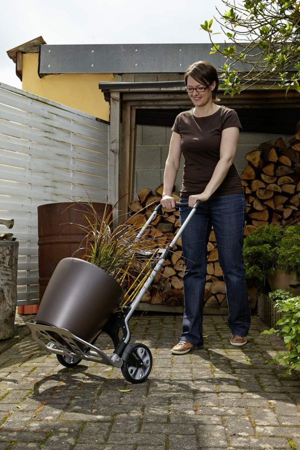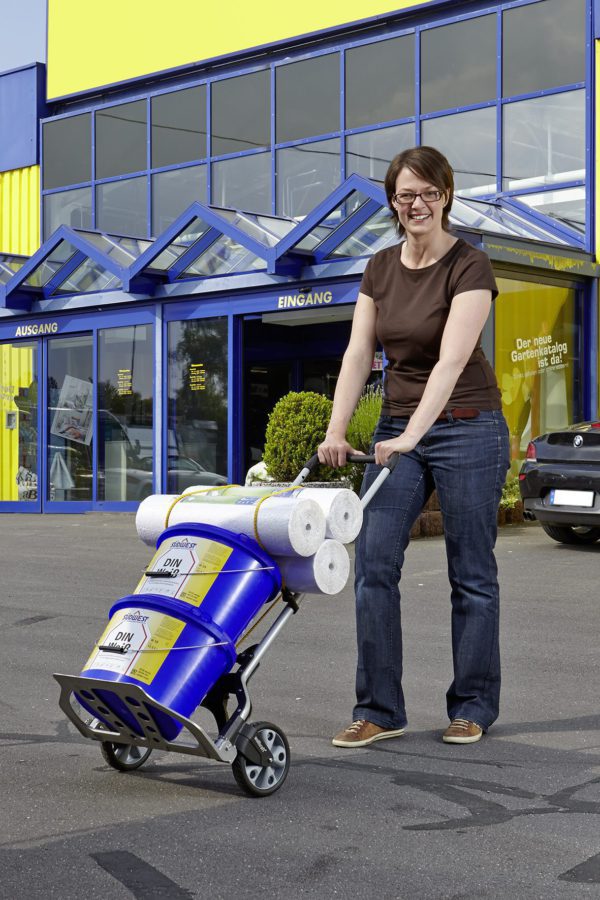Que vous deviez déplacer des packs d’eau, des achats encombrants ou des pots de fleurs, le système de transport TS 850 vous facilite la tâche, avec sa capacité de charge de 100 kg, et est prêt à l’emploi en un clin d’œil grâce à son mécanisme de pliage rapide. Vous trouverez également suffisement de place sur le plateau de base en fonte d’aluminium de 49 x 28 cm. Deux renforts arrière incurvés donnent à vos marchandises une bonne tenue et permettent également un appui optimal des objets ronds tels que des pots de fleurs ou des bouteilles de gaz. Ce compagnon incroyablement compact ne mesure que 50 x 82 x 7,7 cm lorsqu’il est replié, ce qui le rend idéal pour un transport dans un petit coffre. Les roues profilées anti-crevaison d’un diamètre de 18 cm conviennent à un usage à l’intérieur comme à l’extérieur. Le TS 850 permet aussi de passer facilement des marches. Pour un transport sans effort et ergonomique, la hauteur de la poignée ronde en caoutchouc est réglable jusqu’à 110 cm. L’arrondi de la poignée offre suffisamment de place pour les mains, même lors du transport d’objets hauts et encombrants.