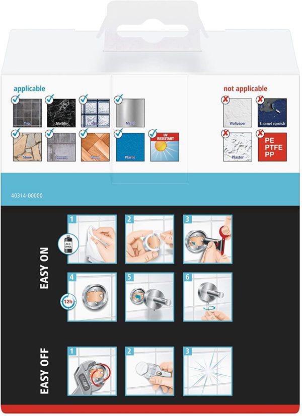 Une finition chromée brillante et des formes rondes et simples pour un design unique. C’est l’accessoire indispensable de toute salle de bain ! Il s’installe facilement sans avoir besoin de percer de trous. En effet, il utilise un système adhésif efficace qu’il suffit de laisser sécher 12 heures et qui permet de ne pas endommager vos murs et surfaces et de le retirer à tout moment sans laisser de traces. Un nouvel adaptateur BK20 vous permet de repositionner votre accessoire où vous le souhaitez.